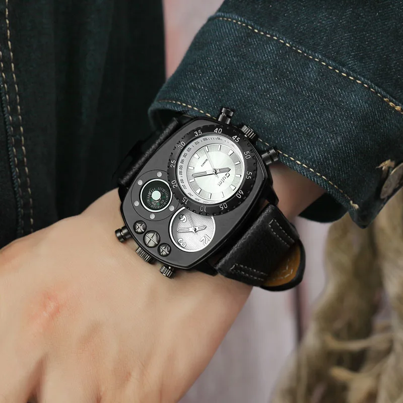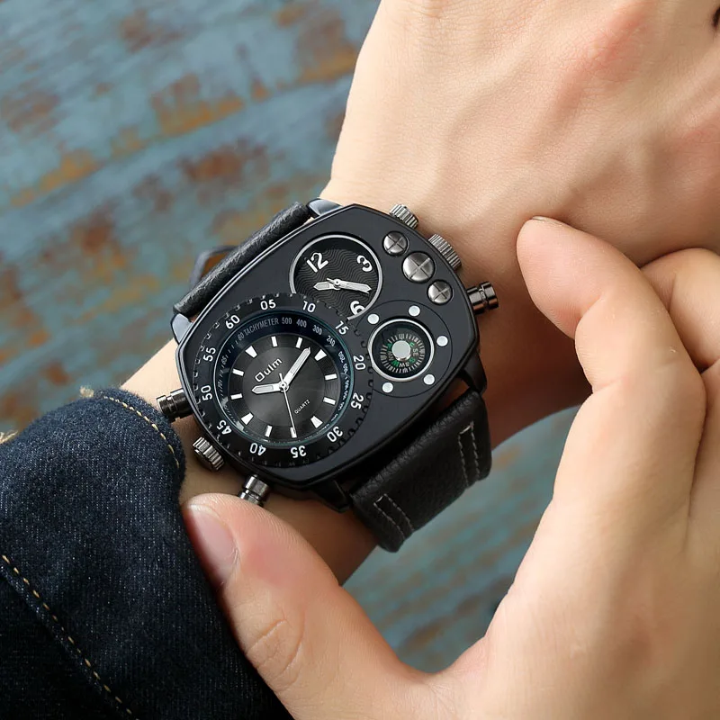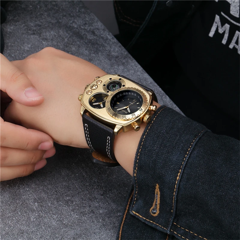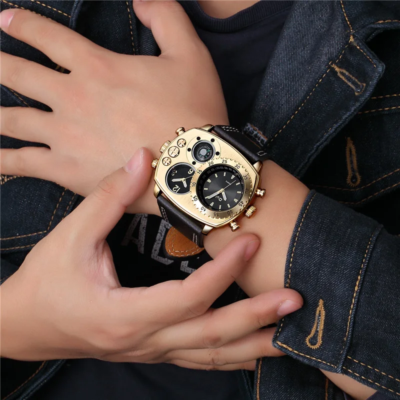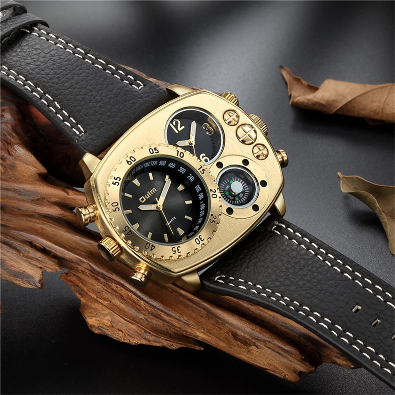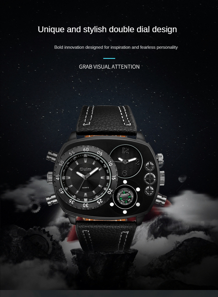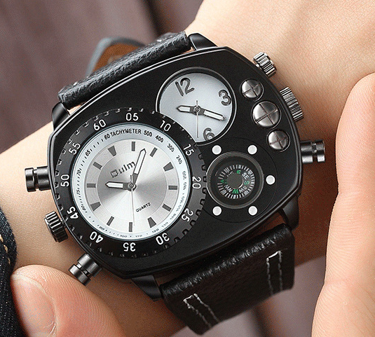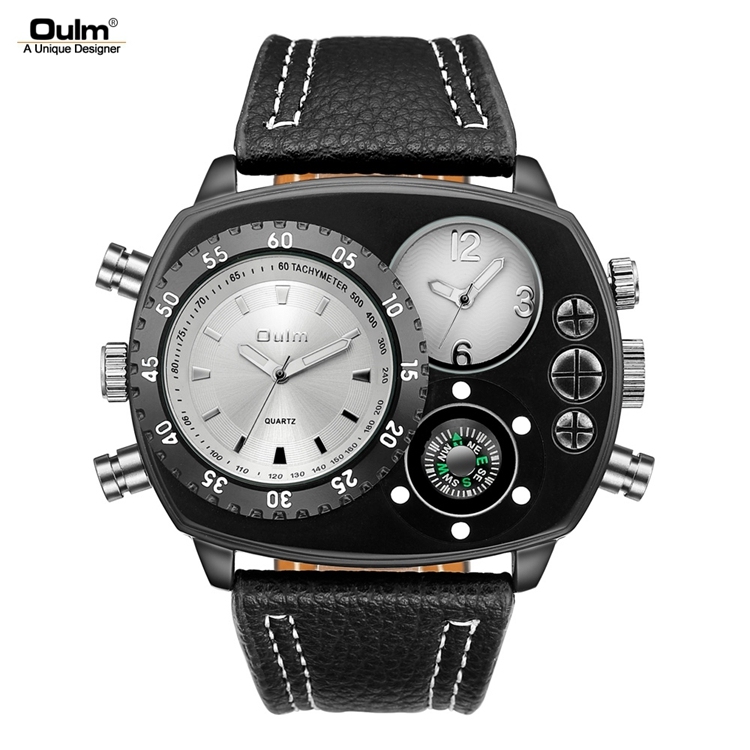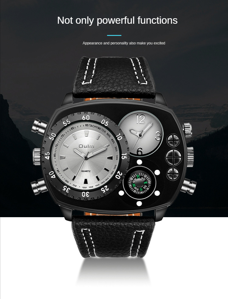 This Oulm model is a unique design watch, new style fashion and luxury quartz, leather strap, elegant and high quality men’s wristwatch. This 3 bar waterproof Oulm watch has a dual dial/time, which means you can set both times to two different time zones. It also has a compass.