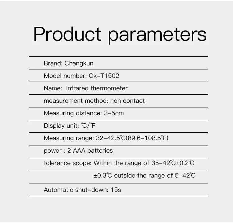 1)Measurement range: Body:32.0~42.5°C(89.6~108.5°F) 2)Accuracy::±0.2°C(Within 35°C-42°C) 士0.3°C(out of range 35°C-42°C)